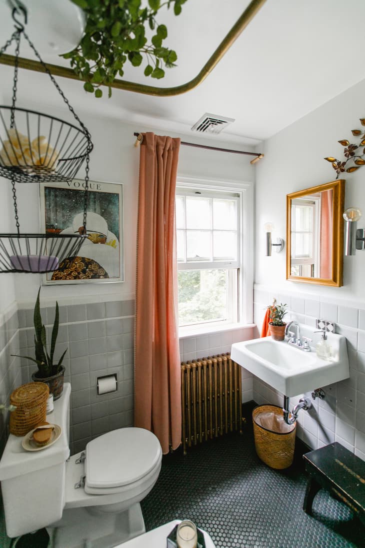 This is a great way to draw the hues of a bedroom into the bathroom, and can easily be installed in a rental.